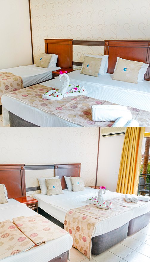 Toplam 118 odamız ve 354 yatak kapasitemizle, standartlardan fazlasını sunuyoruz. Tüm odalarımızda balkon, split klima, uydu TV, çay-kahve seti ve duşlu banyo standarttır. İster geniş aile odalarımızda, ister ara kapılı seçeneklerimizde konaklayın; bahçe manzaralı odalarımızda güne huzurla uyanacaksınız.